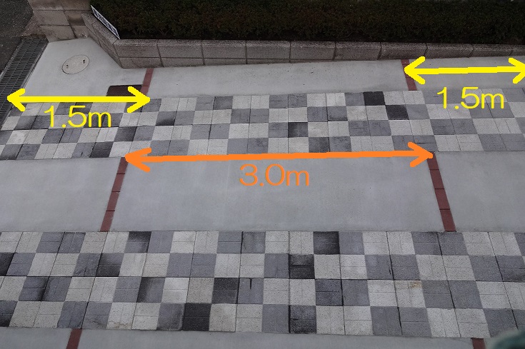 なお、間に赤茶色レンガのラインを入れています。それぞれの距離は下のようになっています。ちなみに一般的な公共駐車場で車輪止めブロックが設置されている場合、後方壁からブロックまでの距離はだいたい1.2mのようですね。目安になれば。