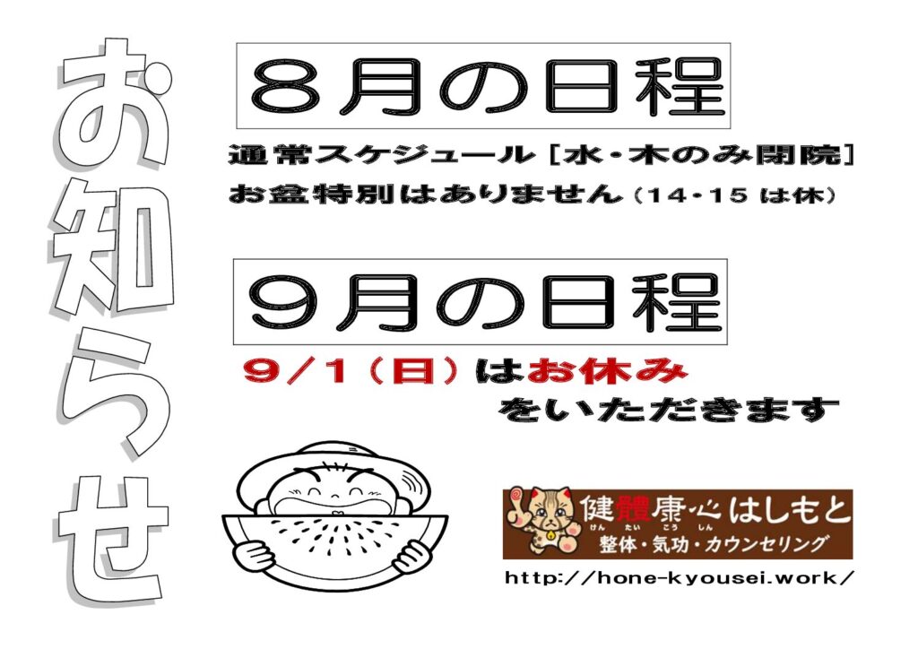 8月&9月スケジュール 2024年7月29日 最終更新日時 : 2024年7月29日 hashimoto 夏本番、暑いですね!。パリでの闘いも熱いです!!当院での夏スケジュールは上記のとおりです。エアコン付きで暑くなくとも、情熱を持って施術しています(照笑)。